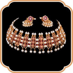 Chinchpeti, one of the crucial ornaments among the Peshwai Collection is a short necklace which perfectly embraces your neck enhancing the grace in your traditional attire. The white, green and pink stones also play a fabulous part in the attainment of this traditional necklace.