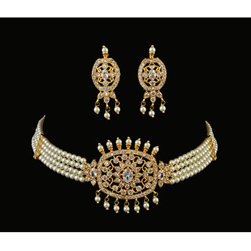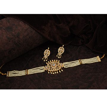 Chinchpeti, one of the crucial ornaments among the Peshwai Collection is a short necklace which perfectly embraces your neck enhancing the grace in your traditional attire. The white, green and pink stones also play a fabulous part in the attainment of this traditional necklaces