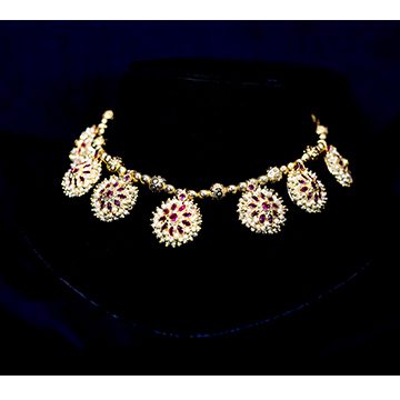 Chinchpeti, one of the crucial ornaments among the Peshwai Collection is a short necklace which perfectly embraces your neck enhancing the grace in your traditional attire. The white, green and pink stones also play a fabulous part in the attainment of this traditional necklace.