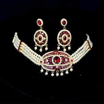 Chinchpeti, one of the crucial ornaments among the Peshwai Collection is a short necklace which perfectly embraces your neck enhancing the grace in your traditional attire. The white, green and pink stones also play a fabulous part in the attainment of this traditional necklace.