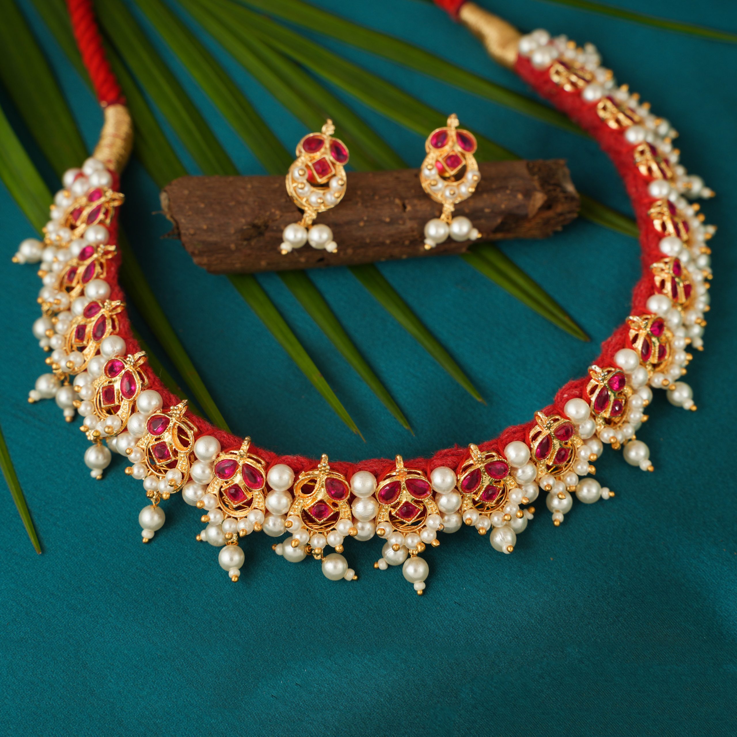 Chinchpeti, one of the crucial ornaments among the Peshwai Collection is a short necklace which perfectly embraces your neck enhancing the grace in your traditional attire. The white, green and pink stones also play a fabulous part in the attainment of this traditional necklace.