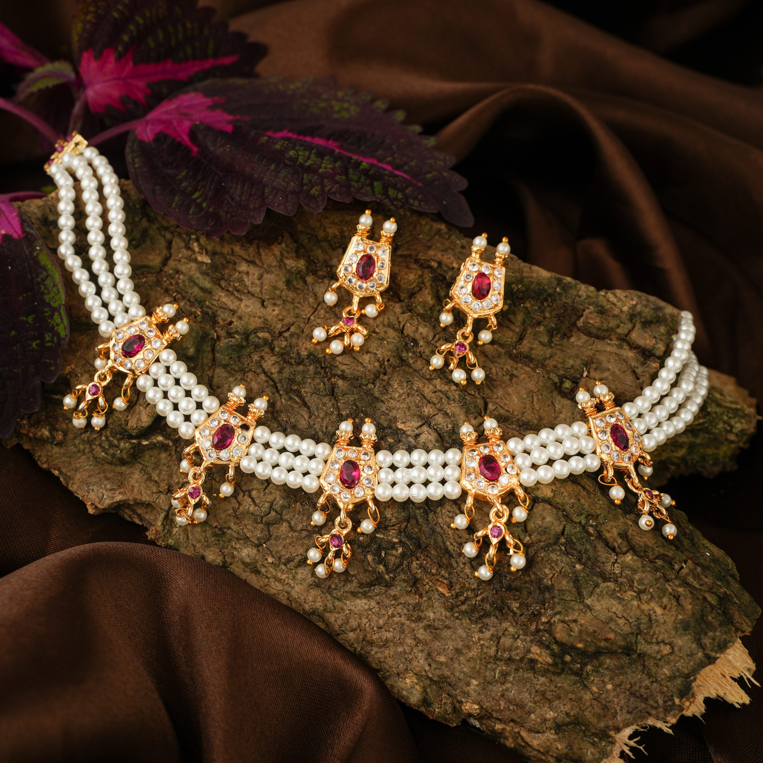 Chinchpeti, one of the crucial ornaments among the Peshwai Collection is a short necklace which perfectly embraces your neck enhancing the grace in your traditional attire. The white, green and pink stones also play a fabulous part in the attainment of this traditional necklace.