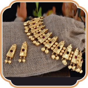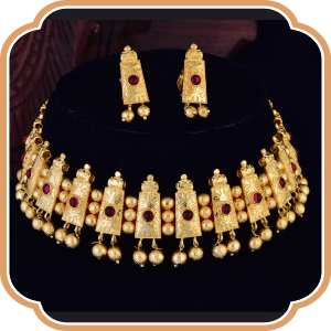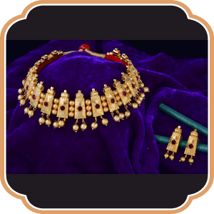 Vajratik, the origin of this short necklace, dates back to Mythology. Once worn by The Goddess Mahalakshmi this jewellery became famous and also an iconic part of Kolhapuri jewellery. This is a short Golden Necklace embedded with Golden beads of different sizes linked with each other perfectly. Vajratik not only gives you an imperial experience but also gives you divine sensation without any flaws.