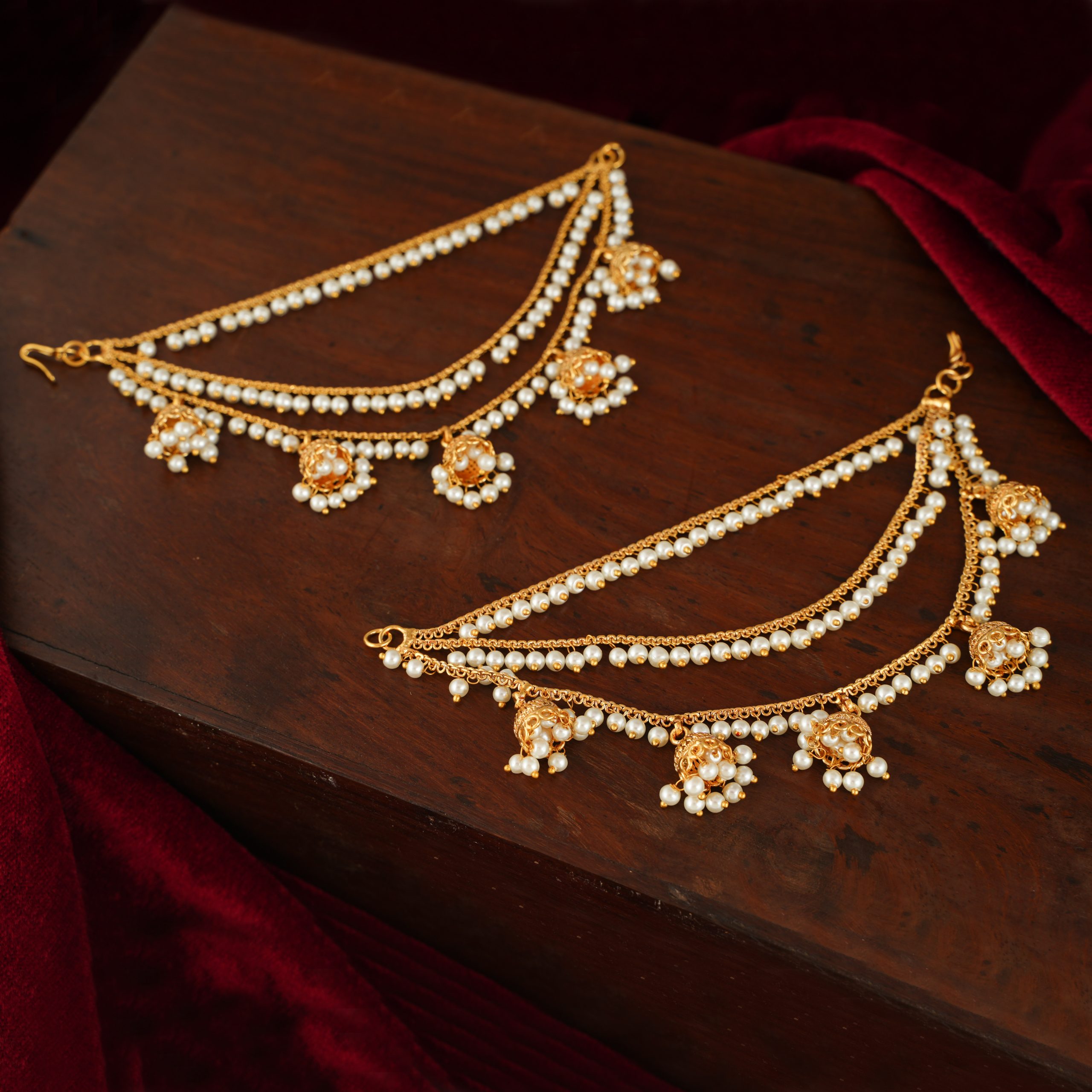 Kaan Vel is a jewellery which stands out in the Peshwai Collection, making it one of the special ornaments in the Peshwai Collection. Its one end is worn in the ear and the other is attached back to the bun which ornaments not only your ear but also your head.