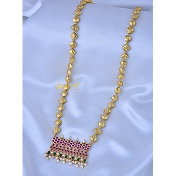 This is a Golden Necklace embedded with Golden beads and stones of different sizes linked with each other perfectly.