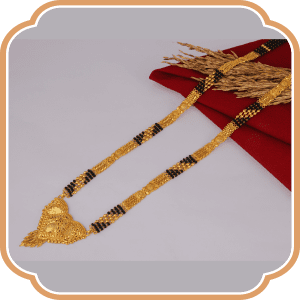 Mangalsutra is considered the jewellery of uttermost importance for a married woman in Indian traditions since the Vedic period. Mangalsutra consists of traditional black beads and a pendant of red golden finishing, suiting perfectly on your attire.