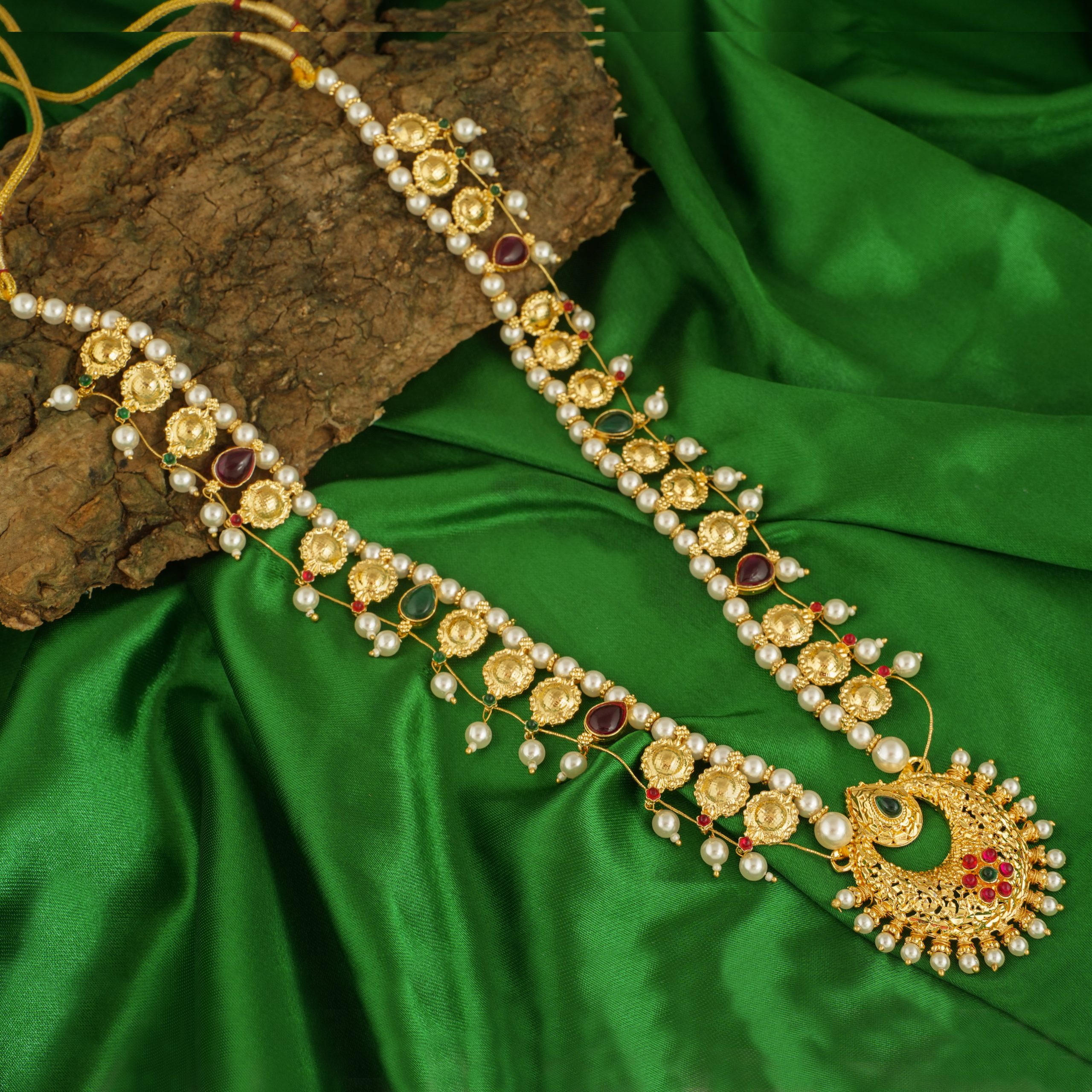 The most famous Jewellery amongst all the Maharashtrian ornaments of all times will always be The Kohapuri Saaj. Saaj resembles 21 leaves on its borders; these 21 leaves feature the Avatars of Lord Vishnu and symbols of Ashtamangal. After the leaves comes, the Kirti Mukh Pendant, which is known as The Good Luck Charm. All the leaves are in conjunction with each other through a thin thread which keeps them aligned.