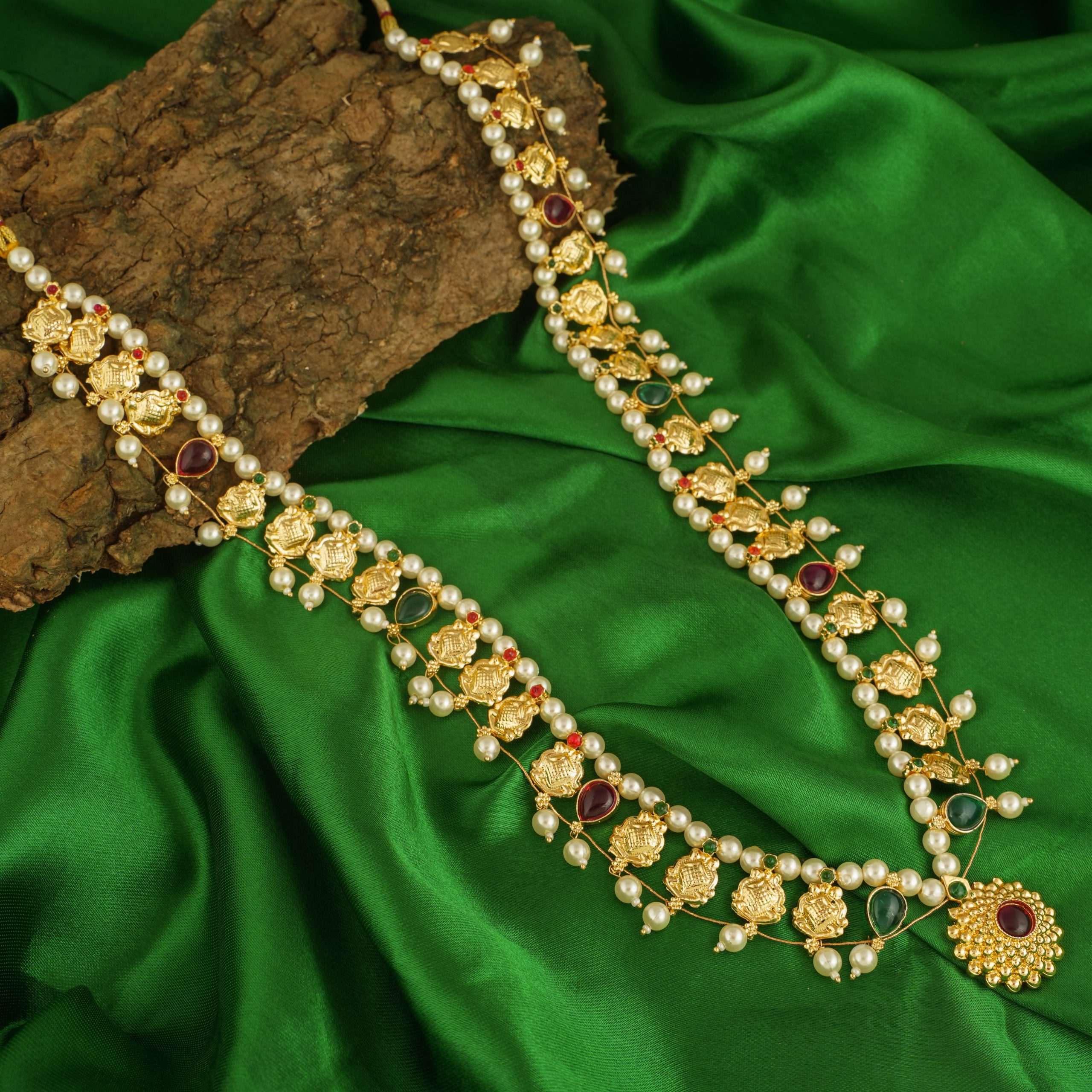 The most famous Jewellery amongst all the Maharashtrian ornaments of all times will always be The Kohapuri Saaj. Saaj resembles 21 leaves on its borders; these 21 leaves feature the Avatars of Lord Vishnu and symbols of Ashtamangal. After the leaves comes, the Kirti Mukh Pendant, which is known as The Good Luck Charm. All the leaves are in conjunction with each other through a thin thread which keeps them aligned.