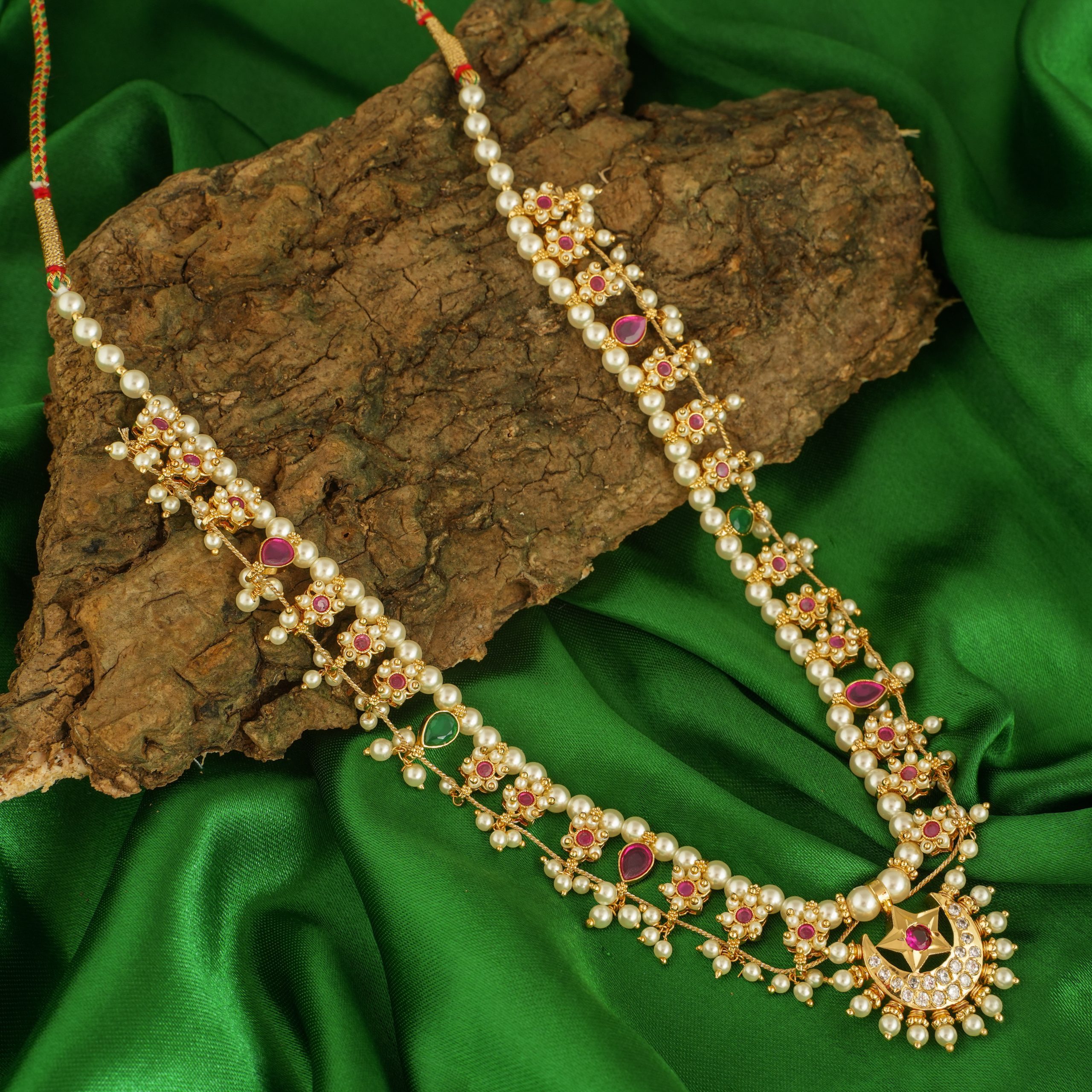 The most famous Jewellery amongst all the Maharashtrian ornaments of all times will always be The Kohapuri Saaj. Saaj resembles 21 leaves on its borders; these 21 leaves feature the Avatars of Lord Vishnu and symbols of Ashtamangal. After the leaves comes, the Kirti Mukh Pendant, which is known as The Good Luck Charm. All the leaves are in conjunction with each other through a thin thread which keeps them aligned.