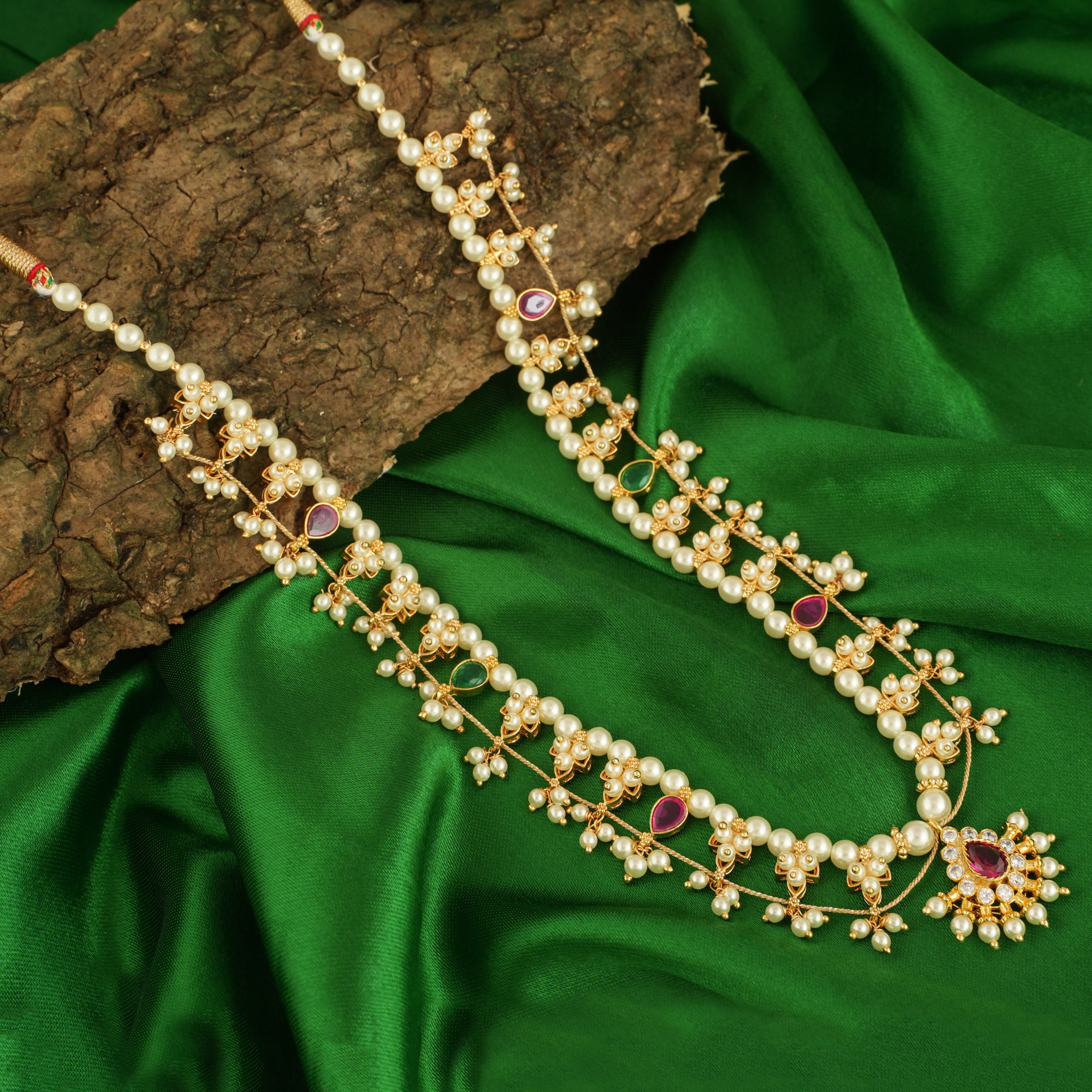 The most famous Jewellery amongst all the Maharashtrian ornaments of all times will always be The Kohapuri Saaj. Saaj resembles 21 leaves on its borders; these 21 leaves feature the Avatars of Lord Vishnu and symbols of Ashtamangal. After the leaves comes, the Kirti Mukh Pendant, which is known as The Good Luck Charm. All the leaves are in conjunction with each other through a thin thread which keeps them aligned.