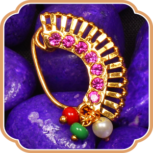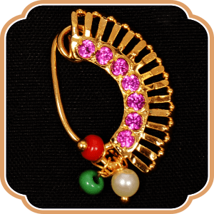 An Iconic ornament from Maharashtra which has now become famous overseas! ‘Nath’ is a nose wear of which origin can be traced centuries ago. This is a pressing wear ornament that does not require any piercing for the nose. Bordered with golden beads and colourful stone in the middle, Nath makes your traditional look more gracious than ever!