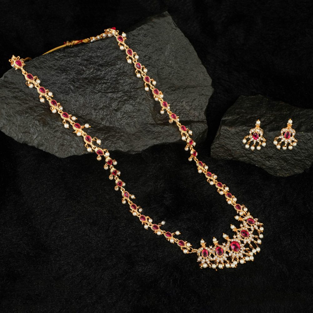 The most remarkable necklace in the box of the Peshwai collection. Raani haar, which means The Queen’s Jewel befits well to it’s name. This long necklace alone gives you the magnificence of superiority in weddings, festivals or functions of any kind. The broad pendant with colourful stones suits perfectly with it’s long length.