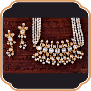 A mid-length adorable pearl necklace crafted uniquely which dawdles gently, close to your warm heart. Featured with perfectly shaped pearls and delicately designed pendants we bring this famous piece, ageing back centuries to be a sensational part of the Maharashtrian Traditional look.