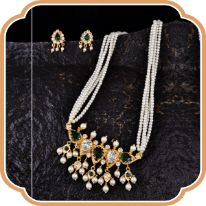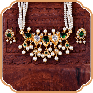A mid-length adorable pearl necklace crafted uniquely which dawdles gently, close to your warm heart. Featured with perfectly shaped pearls and delicately designed pendants we bring this famous piece, ageing back centuries to be a sensational part of the Maharashtrian Traditional look.