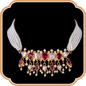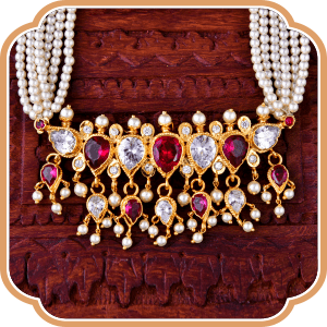 A mid-length adorable pearl necklace crafted uniquely which dawdles gently, close to your warm heart. Featured with perfectly shaped pearls and delicately designed pendants we bring this famous piece, ageing back centuries to be a sensational part of the Maharashtrian Traditional look.