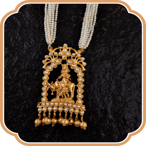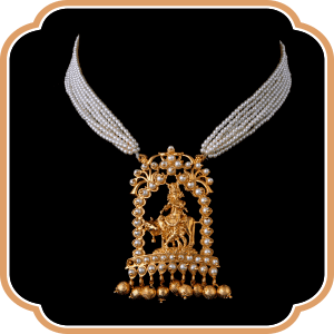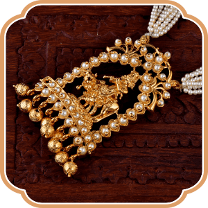 A mid-length adorable pearl necklace crafted uniquely which dawdles gently, close to your warm heart. Featured with perfectly shaped pearls and delicately designed pendants we bring this famous piece, ageing back centuries to be a sensational part of the Maharashtrian Traditional look.