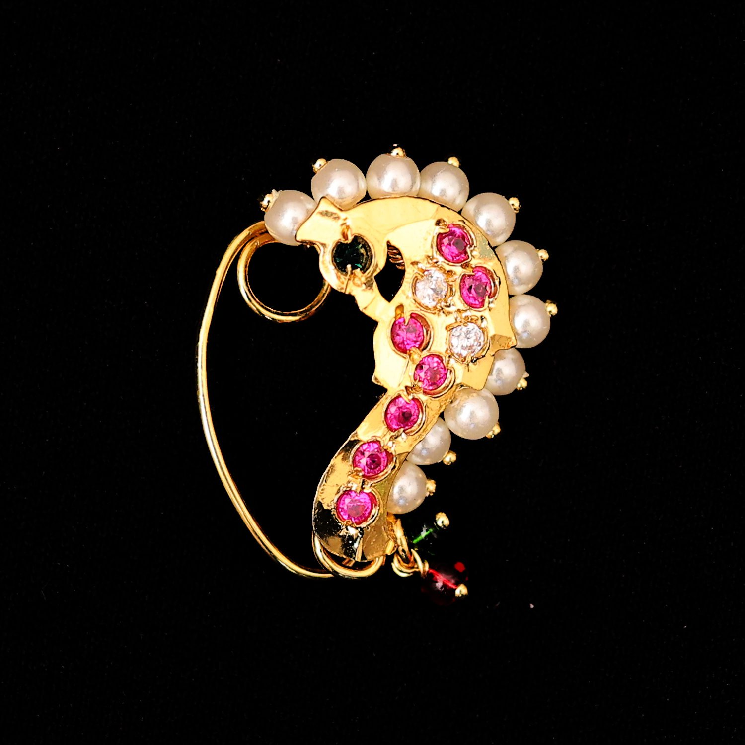 An Iconic ornament from Maharashtra which has now become famous overseas! ‘Nath’ is a nose wear of which origin can be traced centuries ago. This is a pressing wear ornament that does not require any piercing for the nose. Bordered with golden beads and colourful stone in the middle, Nath makes your traditional look more gracious than ever!