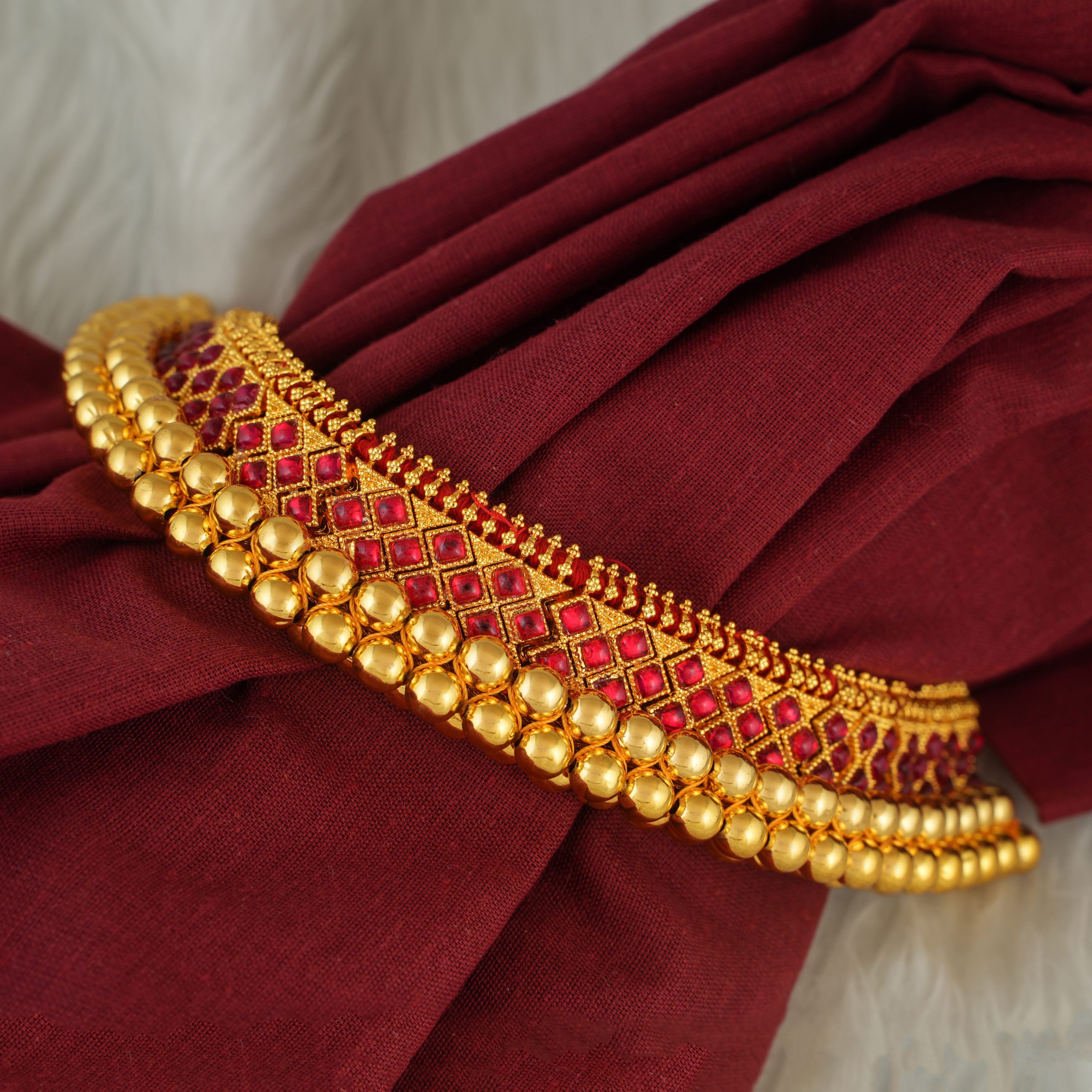 This is a Golden Necklace embedded with Golden beads and stones of different sizes linked with each other perfectly.