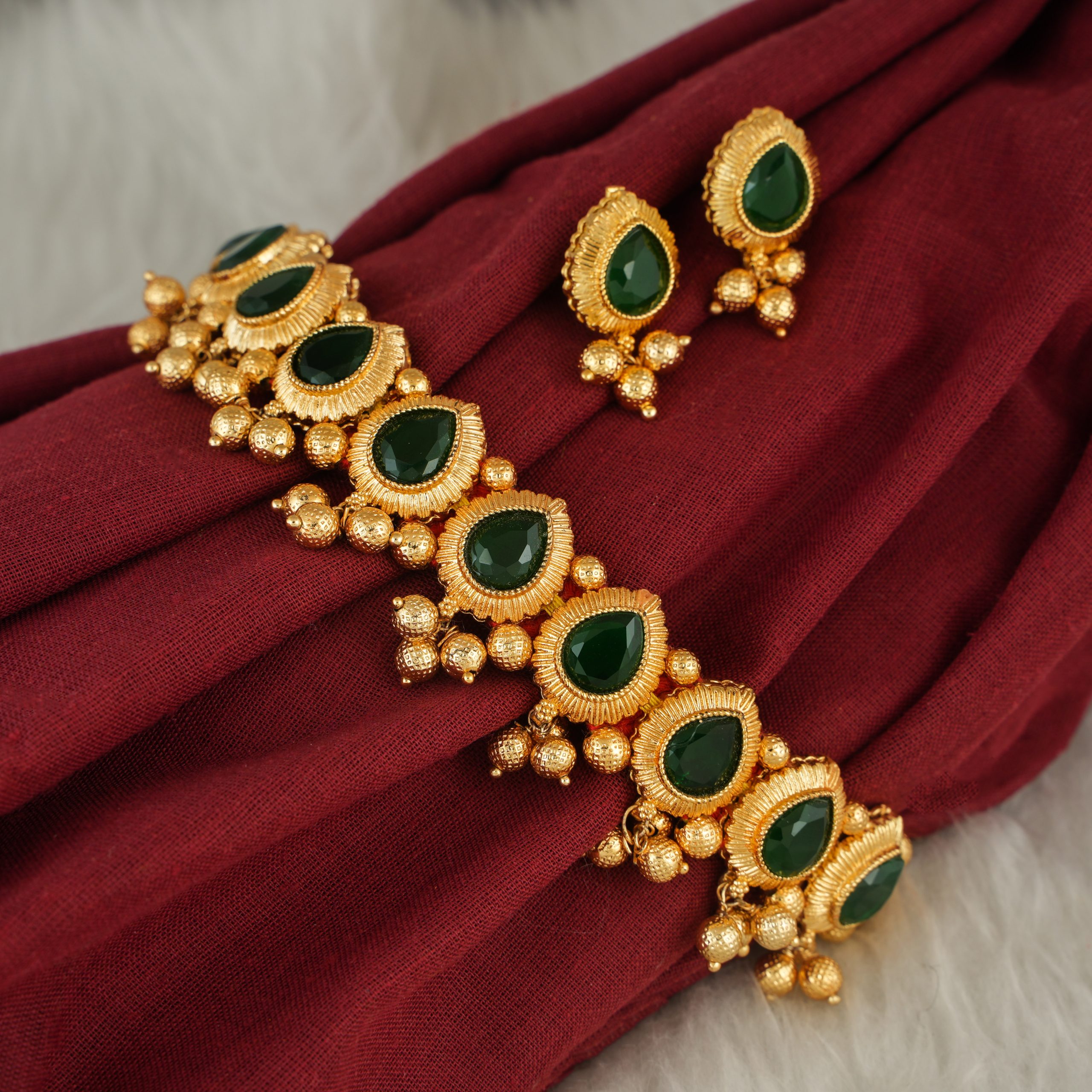 This is a Golden Necklace embedded with Golden beads and stones of different sizes linked with each other perfectly.