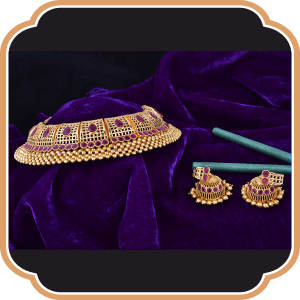 Vajratik, the origin of this short necklace, dates back to Mythology. Once worn by The Goddess Mahalakshmi this jewellery became famous and also an iconic part amongst Kolhapuri jewelleries. This is a short Golden Necklace embedded with Golden beads of different sizes linked with each other perfectly. Vajratik not only gives you an imperial experience but also gives you divine sensation without any flaws.