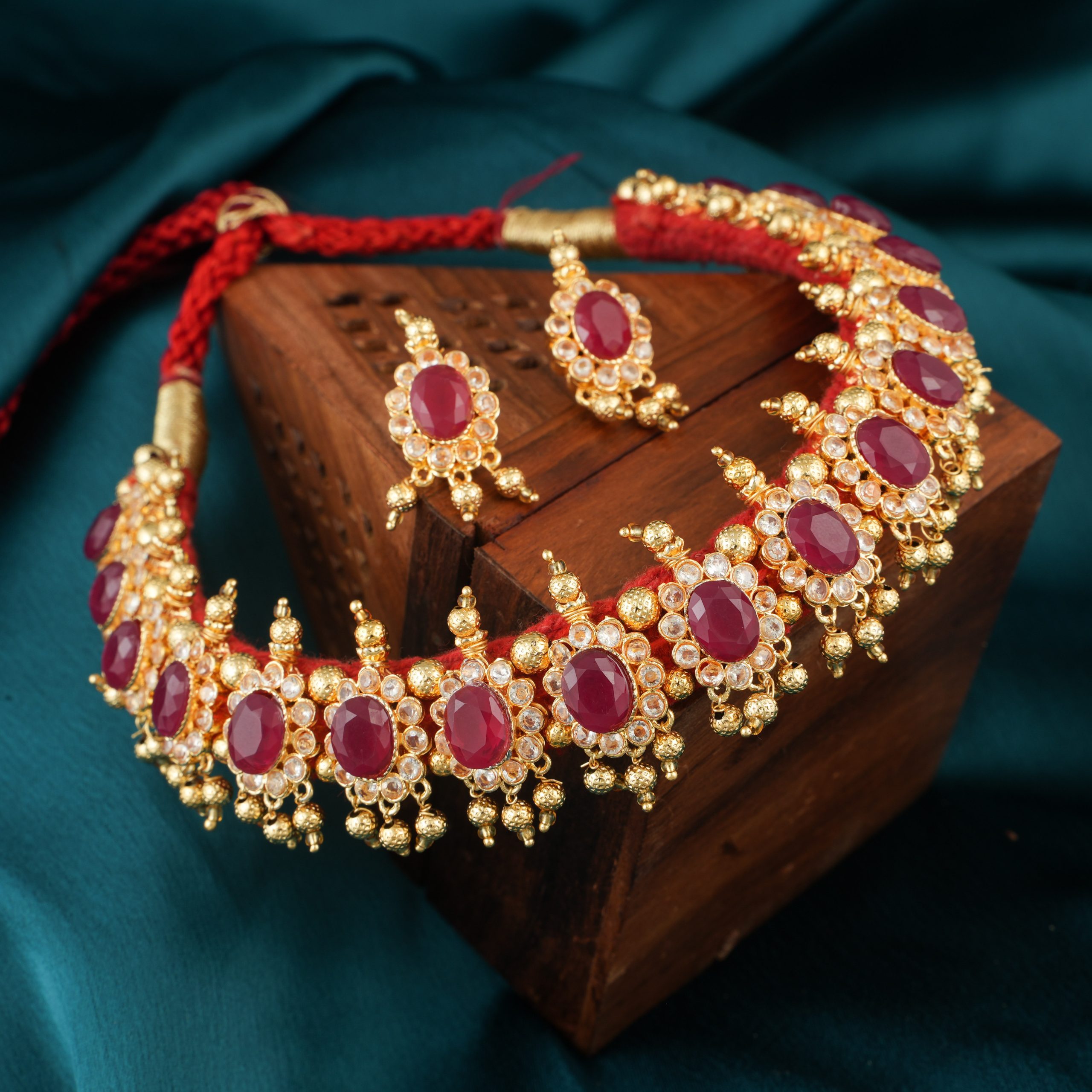 This is a Golden Necklace embedded with Golden beads and stones of different sizes linked with each other perfectly.