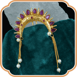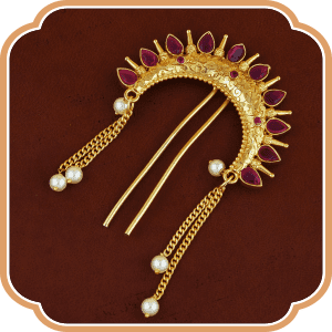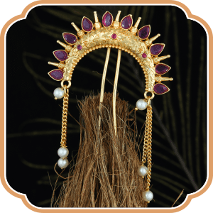 The Peshwai Attire focuses on ornating a woman in the most regal way possible. Veni is an ornament which is pressed in the bun, making it no less than a crown.